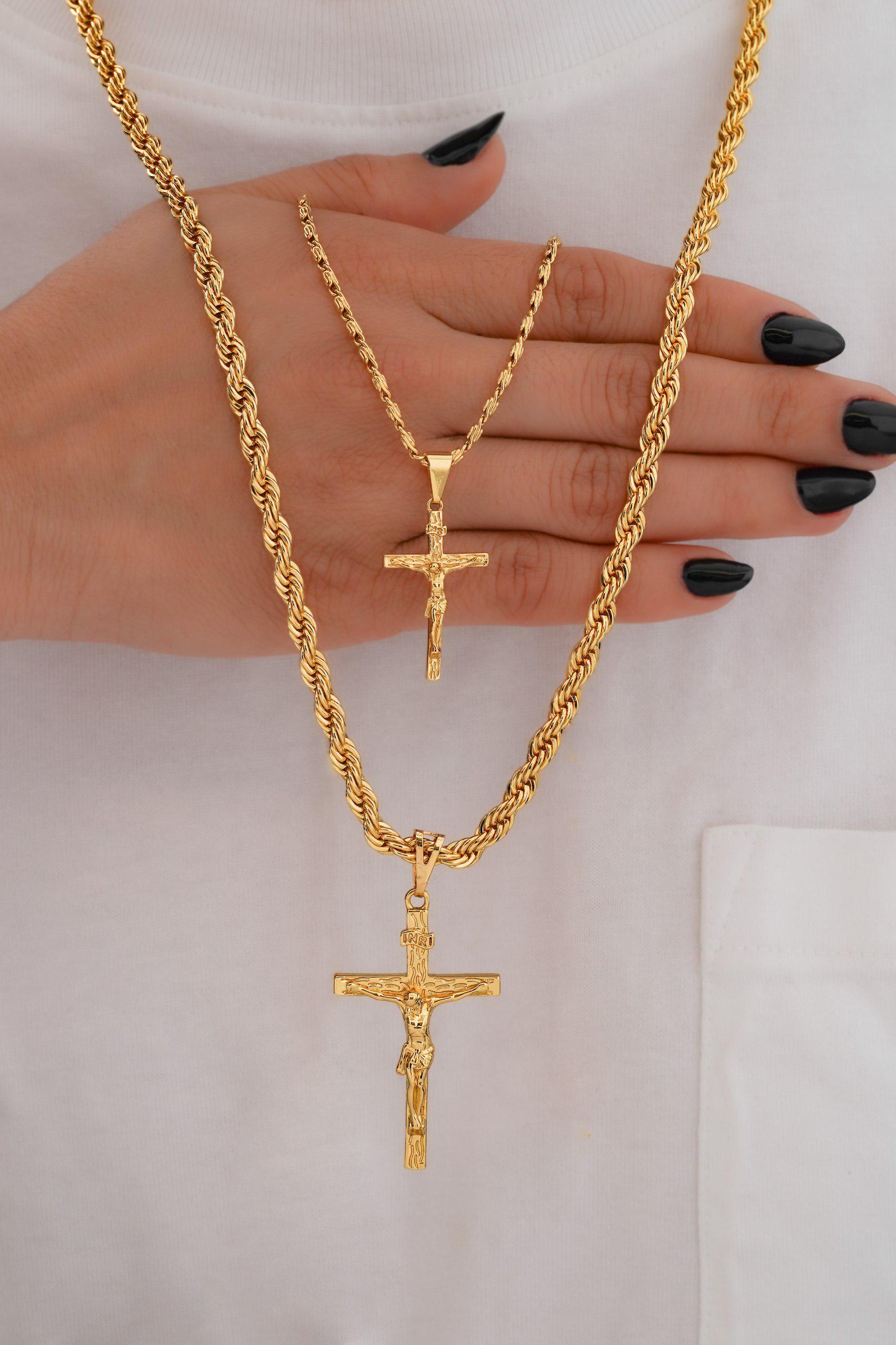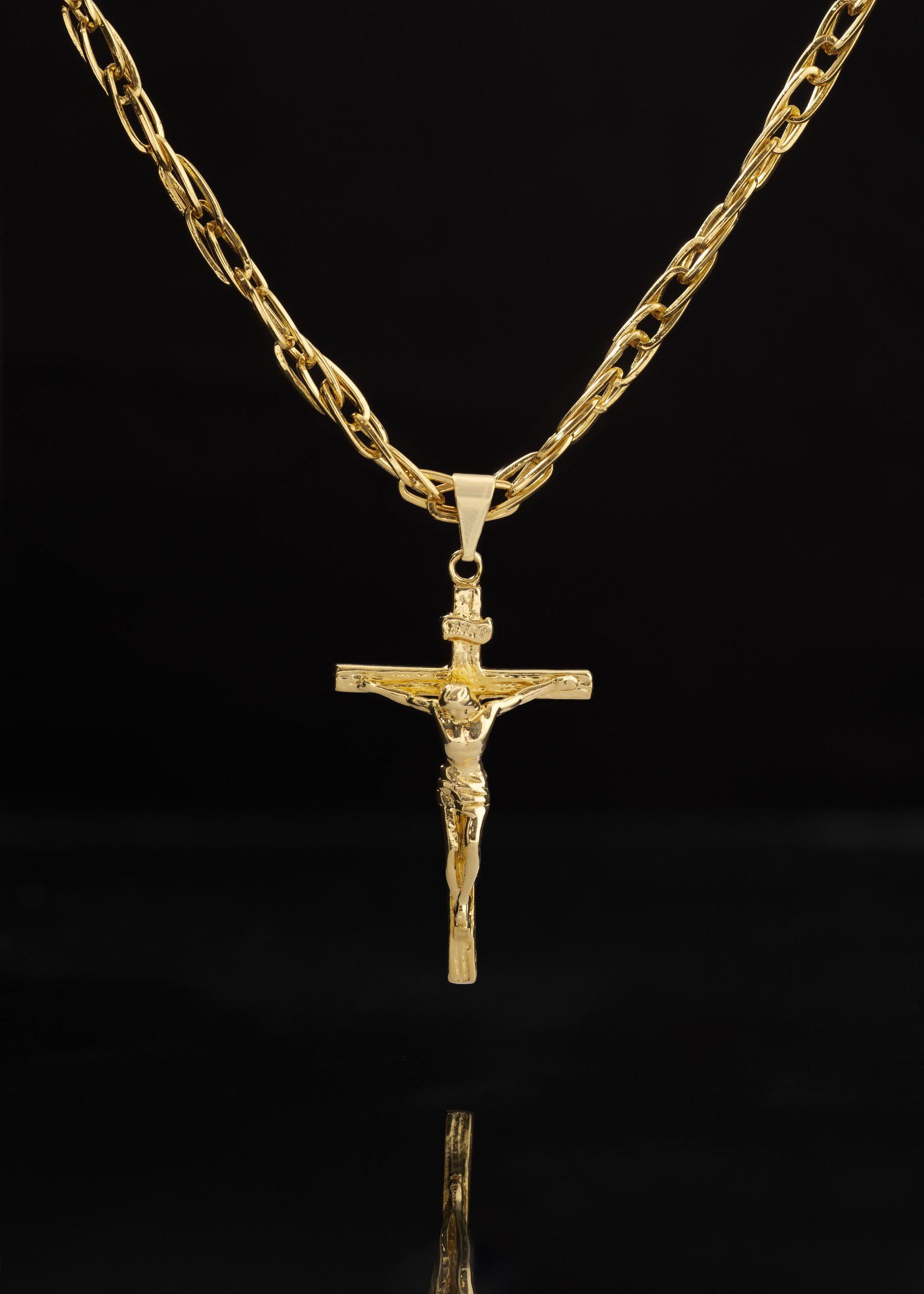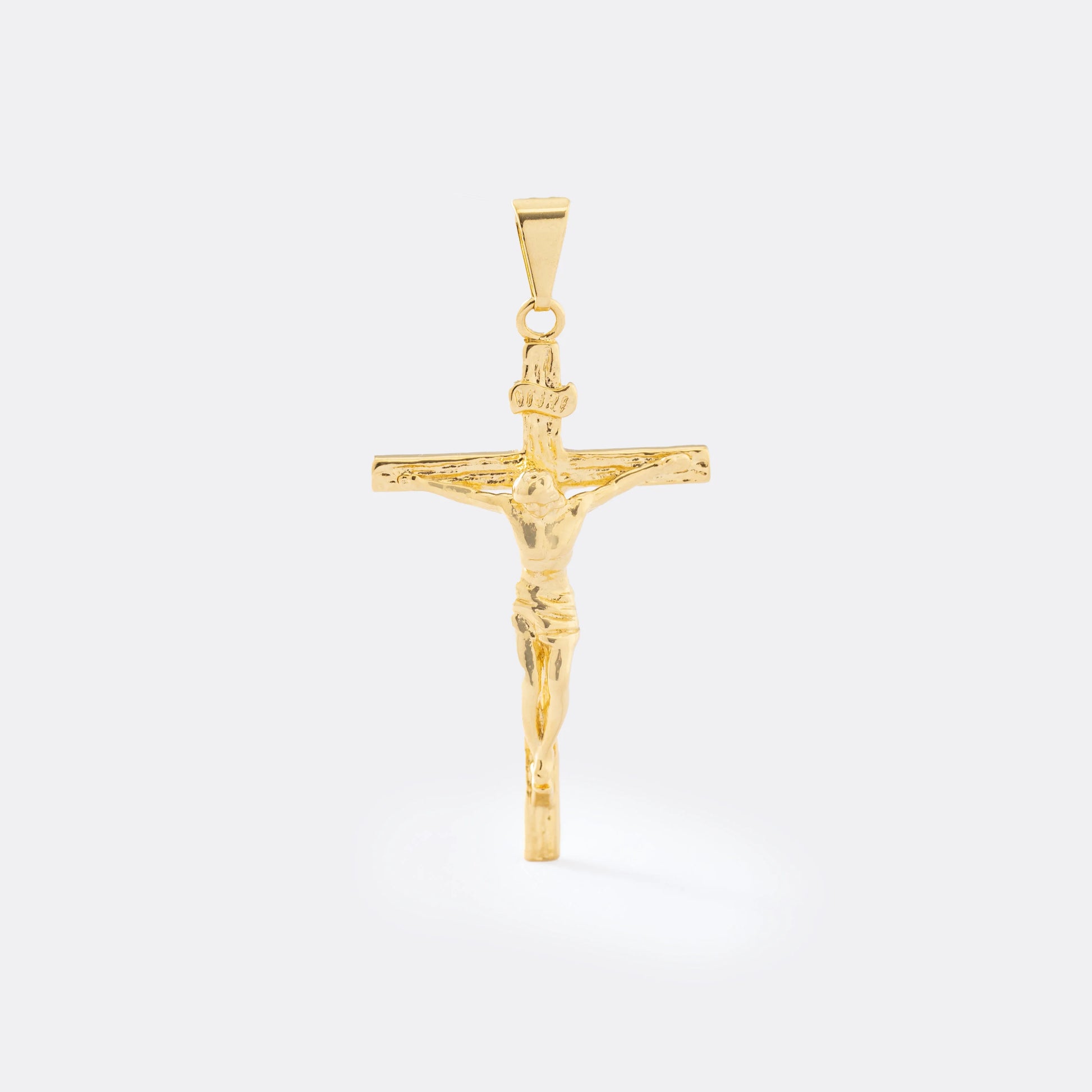 Un símbolo poderoso de devoción y esperanza. Este dije representa a Jesús en la cruz del calvario, elaborado con detalles finos en oro laminado 18K.