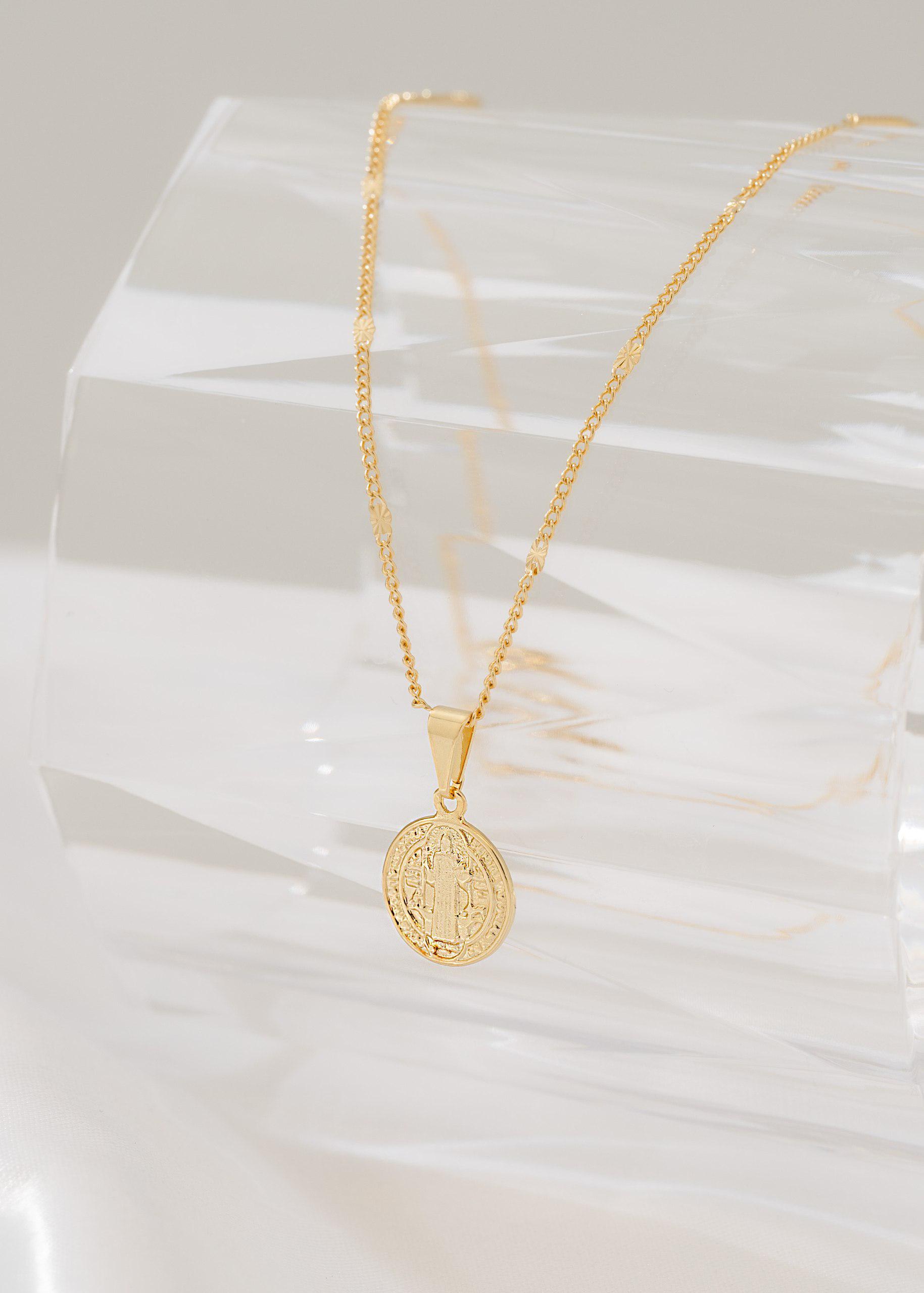 Diseñado en oro laminado 18K, su medalla representa la lucha contra las malas energías y la protección divina que te acompaña a donde vayas.